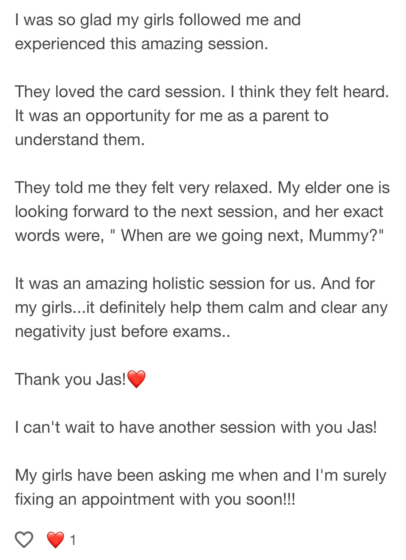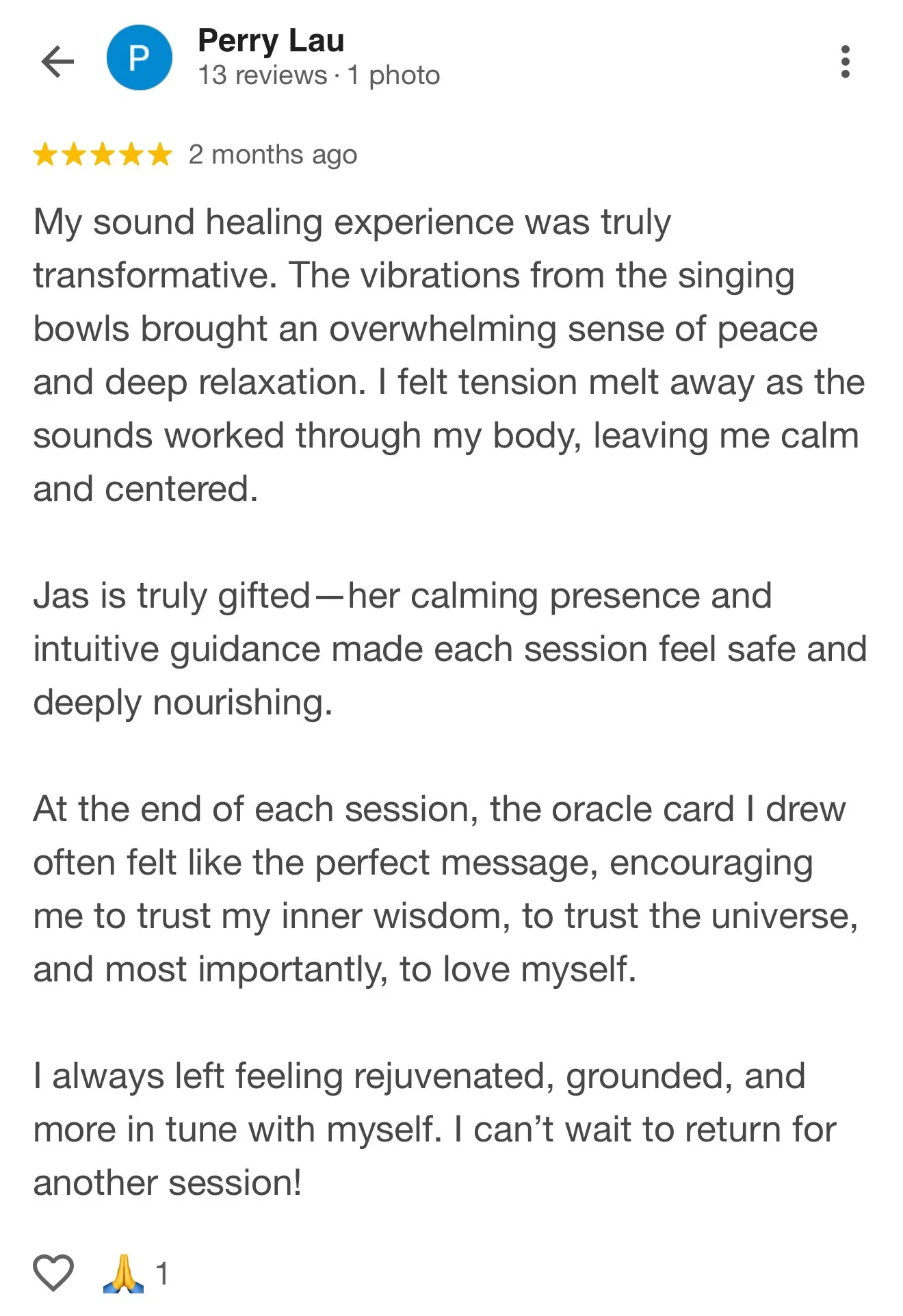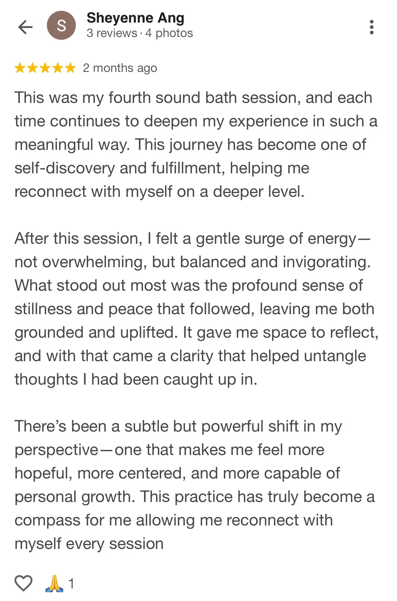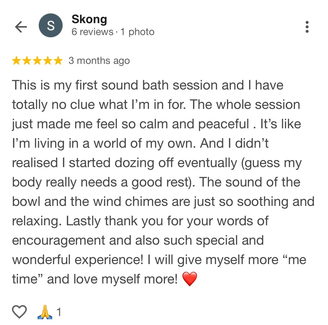 Testimonial for Sound bath & Sound Healing session in Singapore. Calming, stress-relieving, and peaceful experience.